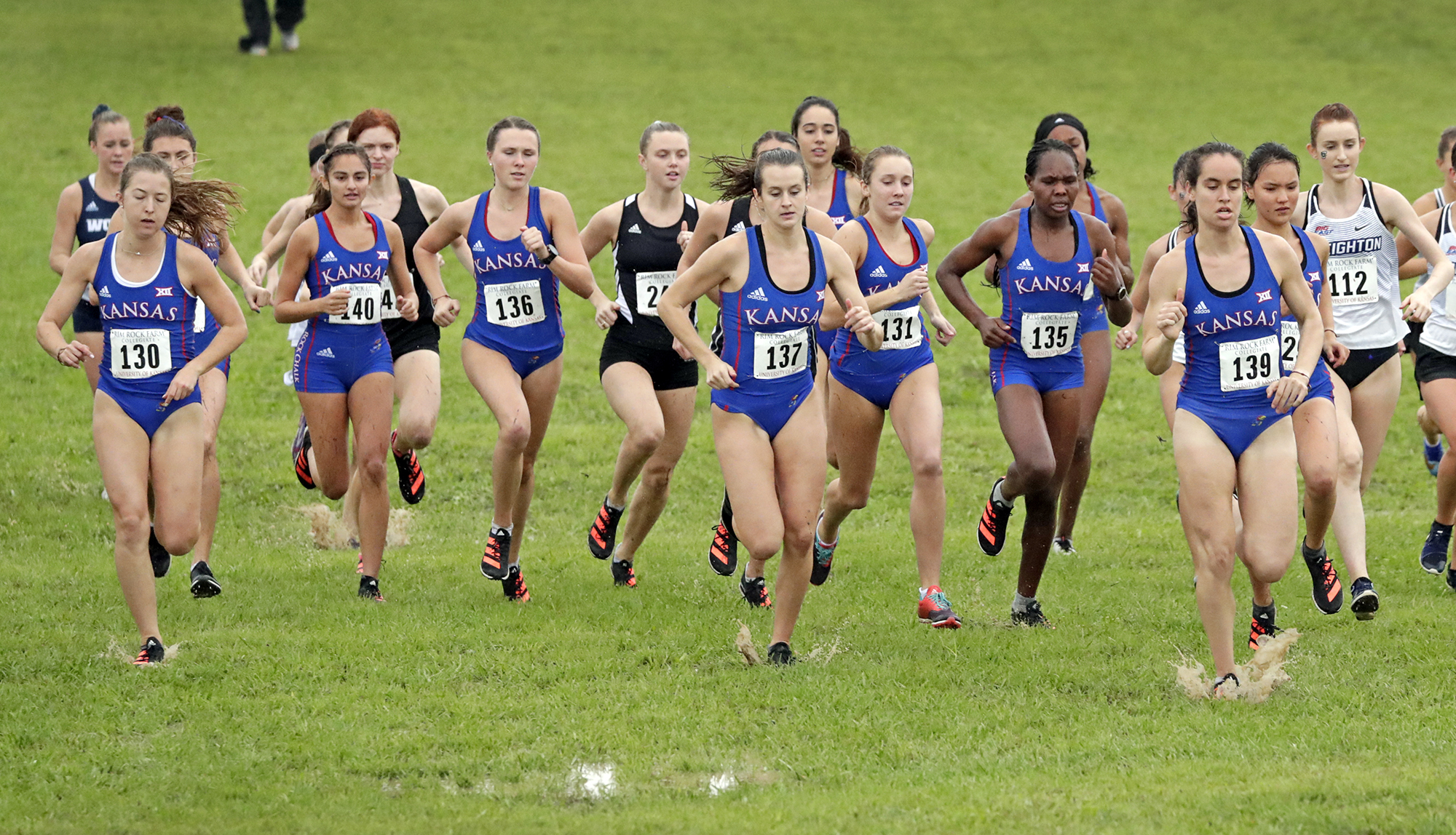 Michael Melgares was the first collegian to complete the 8K course at Rim Rock Farm, traversing the wet and muddy conditions in a time of 25:47.4. The top runner of the day donning the Crimson and the Blue was approximately 10 seconds behind the overall top-two unattached finishers of the race, Joe Moore (25:30.7) and Chris Melgares (25:31.7), both members of the Kansas City Smoke. Running as a pack worked out well for the Jayhawk men, as they saw four finishers among the top-10, which led to their team title.