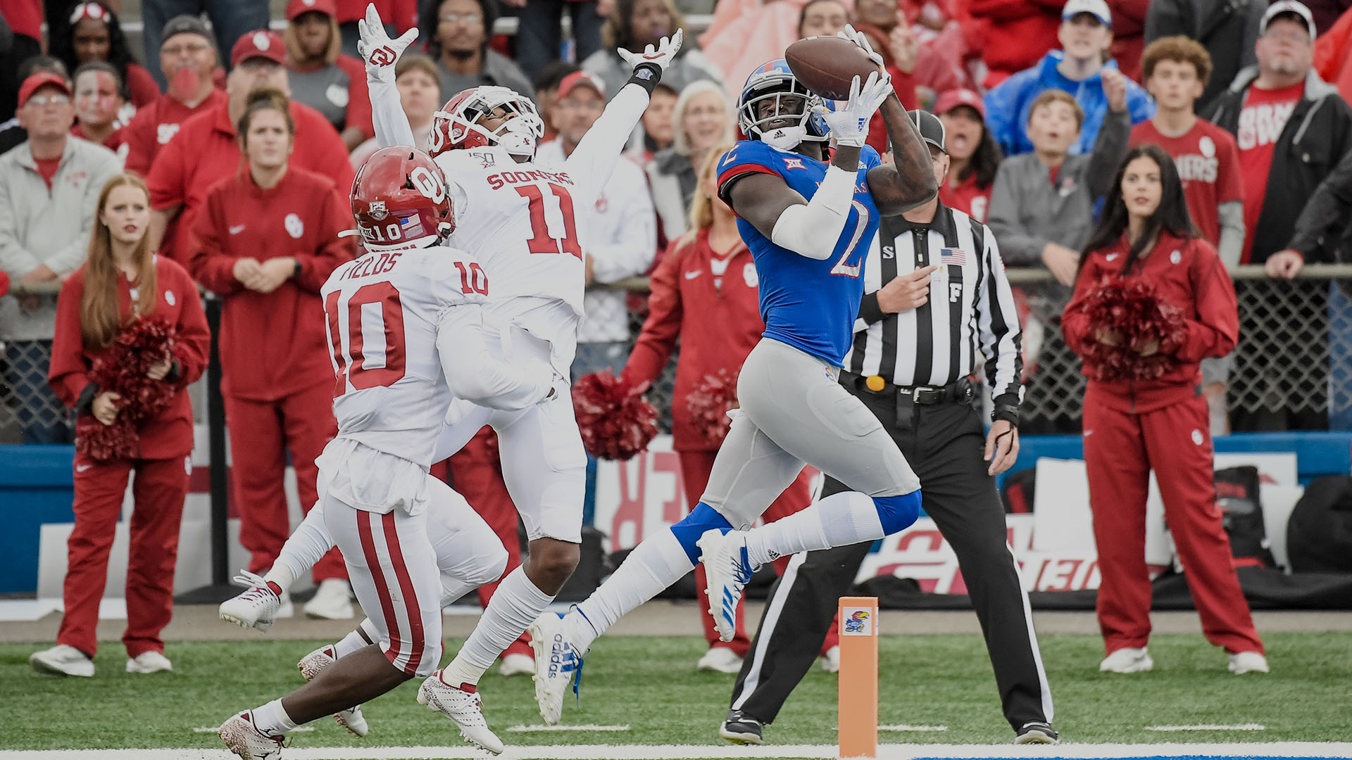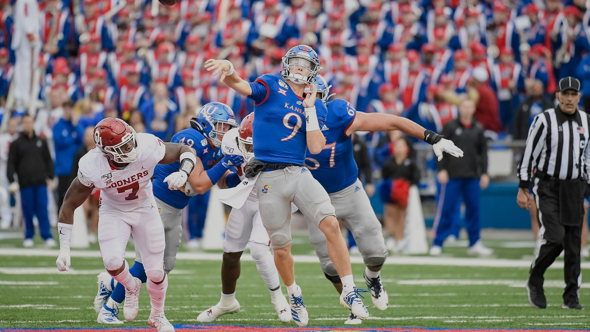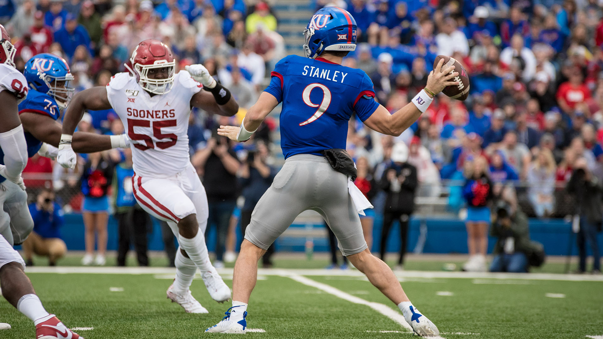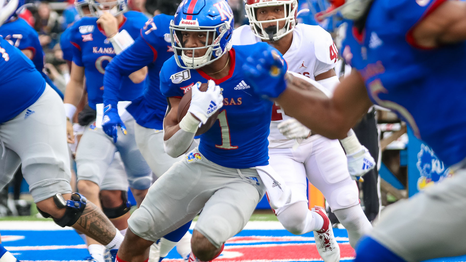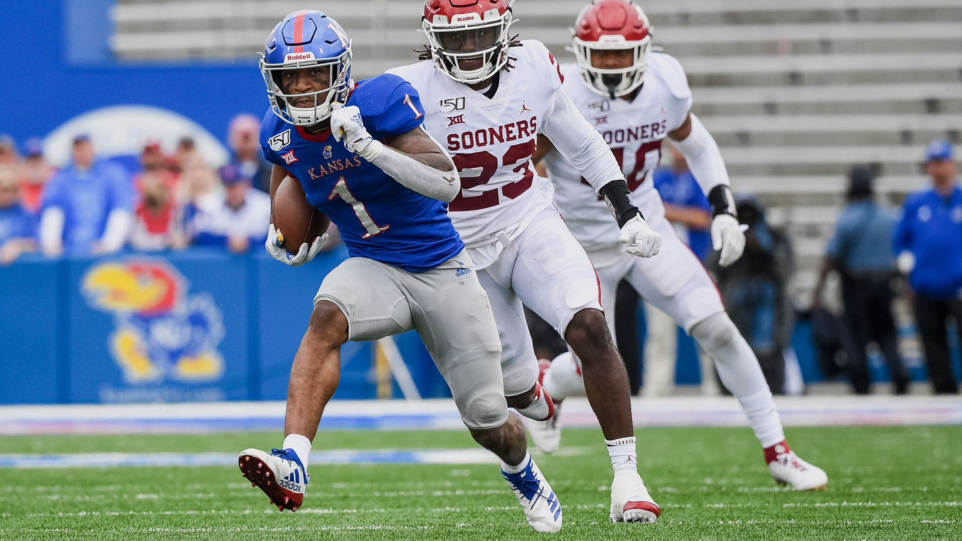 LAWRENCE, Kan. – The No. 6/4-ranked Oklahoma offense proved too powerful to overcome as the Kansas football team dropped its third-straight game, 45-20, Saturday afternoon at David Booth Kansas Memorial Stadium.