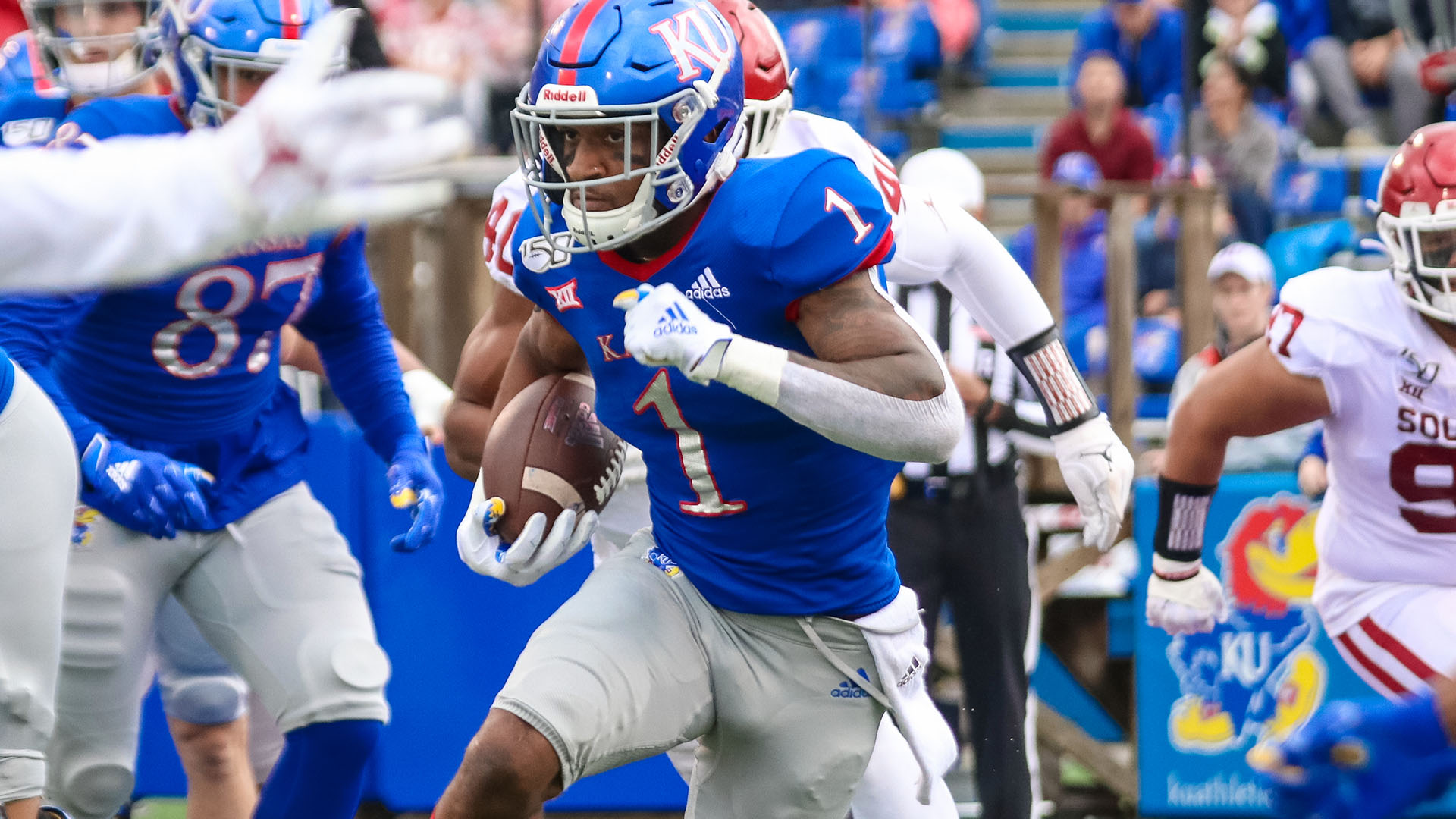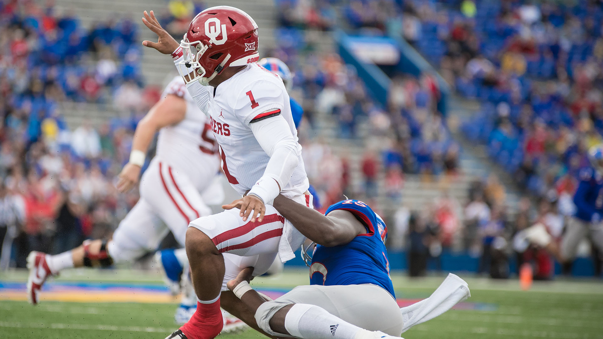 The Sooners (6-0, 3-0 Big 12) racked up 545 yards of total offense, including 277 yards in the air and 268 yards on the ground. The Jayhawks (2-4, 0-3 Big 12) combined for 360 yards with sophomore running back Pooka Williams Jr., picking up over a third of those on the ground (137).