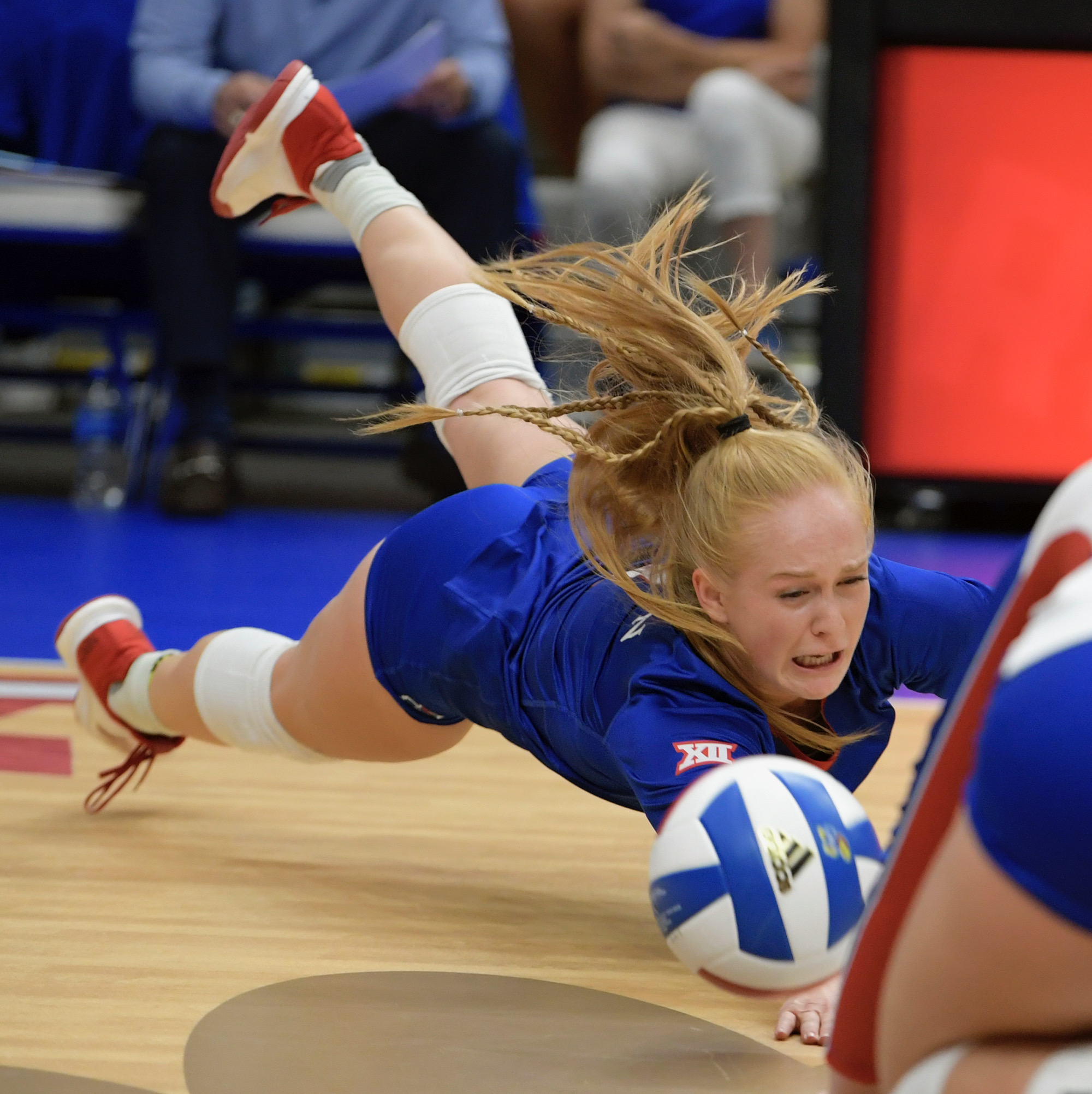 A trio of Jayhawks led the way on the night, with seniors Zoe Hill and Ashley Smith along with sophomore Rachel Langs, each finishing with six kills. Junior Sara Nielsen finished with 26 assists, while Allie Nelson had a team-high eight digs.