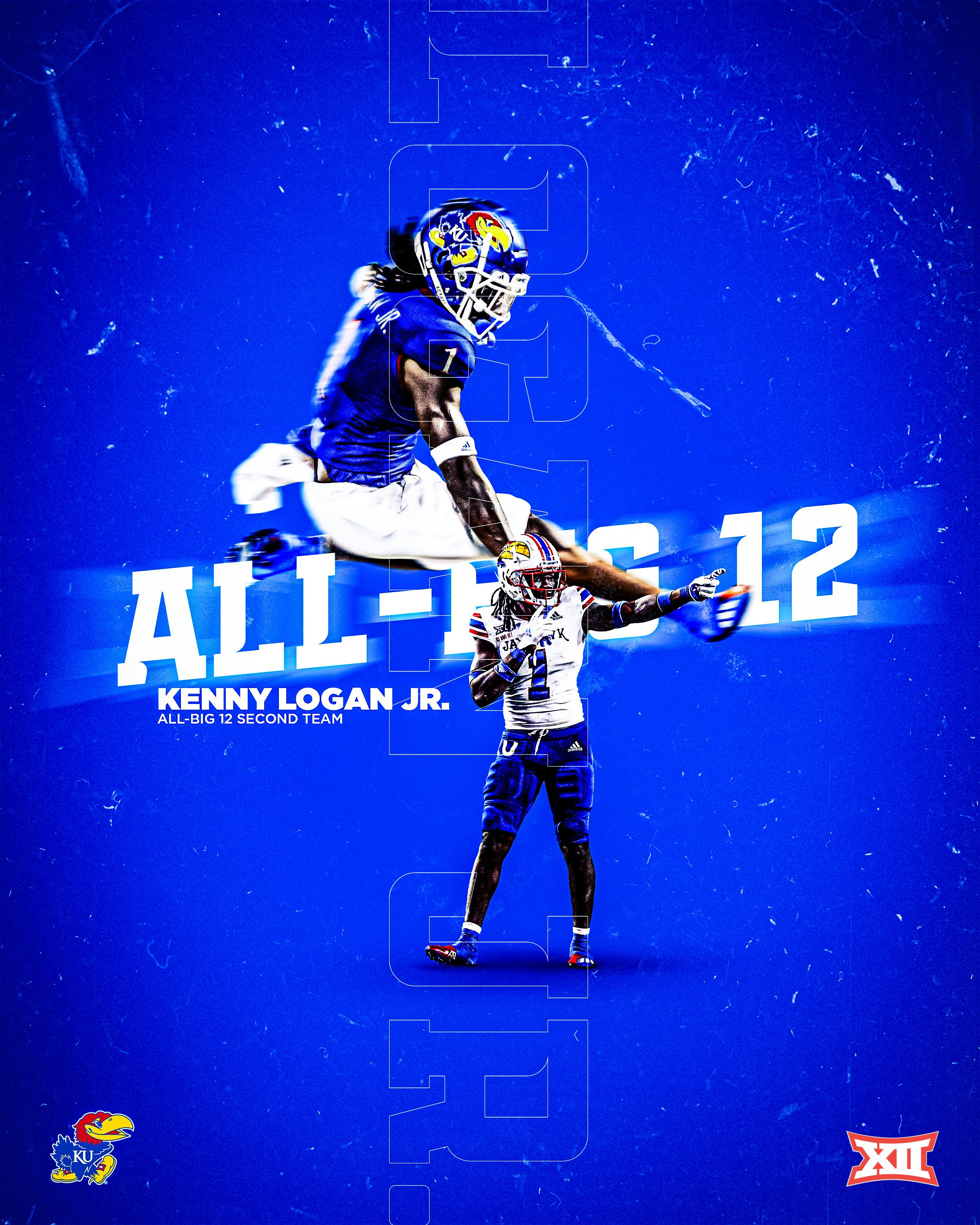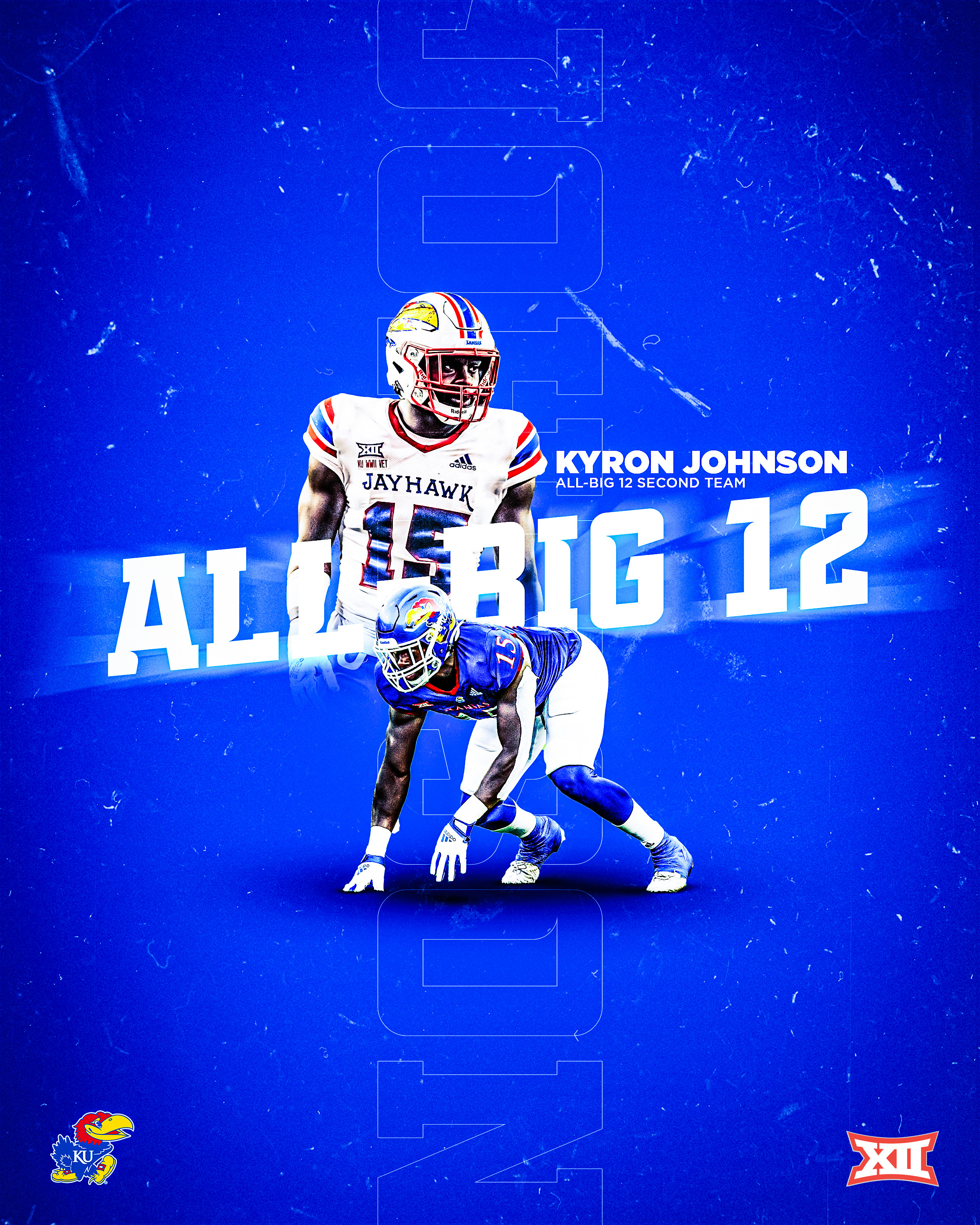 LAWRENCE, Kan. – The Kansas Jayhawks had seven players named All-Big 12 on Thursday, the league announced, headlined by a pair of second-team selections in defensive end Kyron Johnson and safety Kenny Logan Jr. The Jayhawks also had five players named to honorable mention All-Big 12, including left tackle Earl Bostick Jr., wide receiver Kwamie Lassiter II, linebacker Rich Miller, running back Devin Neal and center Mike Novitsky.
