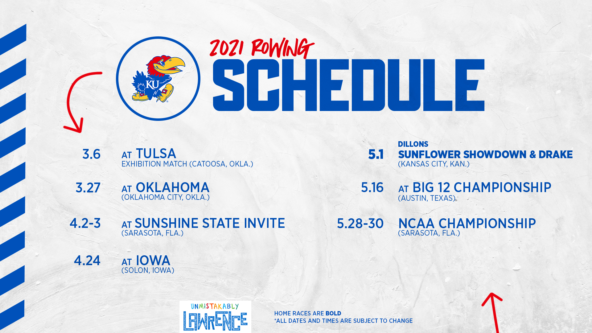LAWRENCE, Kan. – Kansas rowing announced its 2021 spring race schedule Tuesday. The Jayhawks are slated to compete in five regular season races.