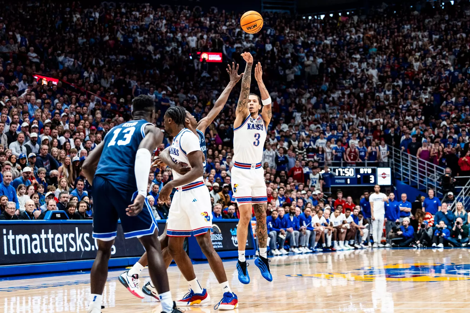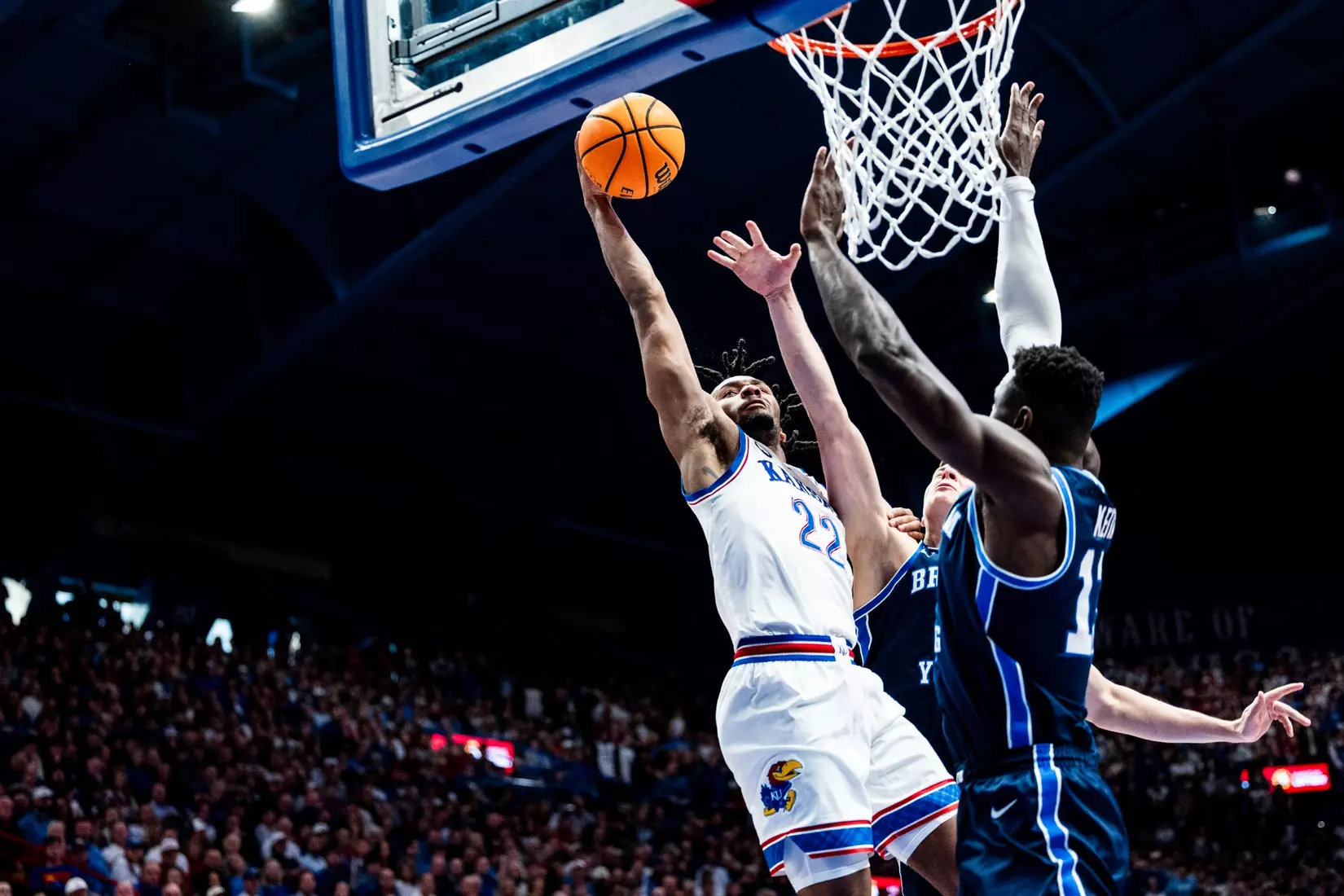 BYU freshman AJ Dybantsa, who entered the game averaging a nation-leading 23.6 points, went without a shot until the 11:24 mark in the first half. Dybantsa scored his first basket with 7:22 left in the period, ending a 13-0 run by the Jayhawks with a 3-pointer. He finished with 17 points.